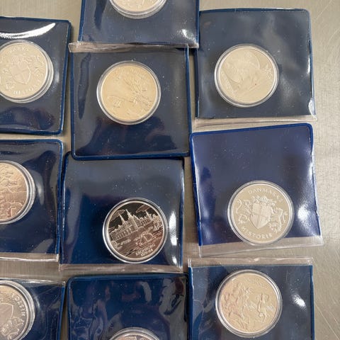 Den Kgl. Mønt sølvmønter samling. Flere erindrings- og jubilæumsmønter i sølv, leveret i originale etuier med tilhørende informationskort. En mønt leveres i plastpose. Egnet til samlere af danske erindringsmønter og numismatikere, der ønsker mønter fra Den Kongelige Mønt i sølv med forskellige motiver og årgange.