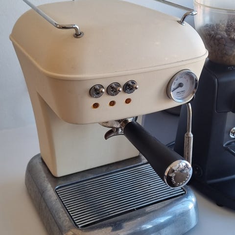 Ascaso mini, virker upåklageligt. Lidt af sølvfarven er røget af der hvor man trykker med portafilteret men svært at undgå. Har også Ascaso espressomaskinen til salg i et andet opslag.