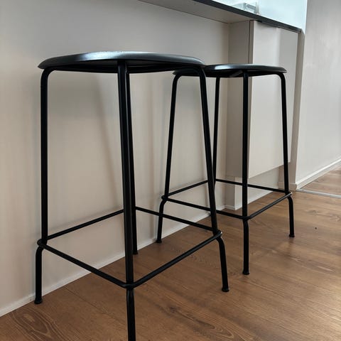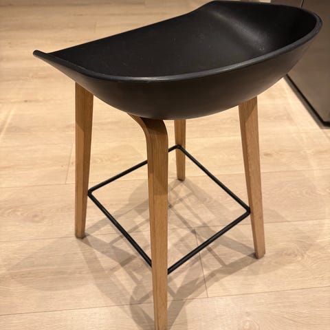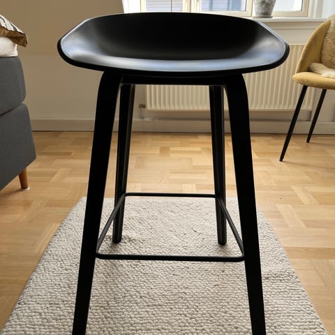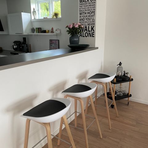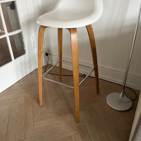 Velholdt Hay barstol til køkkenbordet i siddehøjde 64cm med hvidt sæde og træben. Stolen sælges da vi er skiftet til nogle andre, da vi skulle bruge flere og trængte til et andet udtryk.