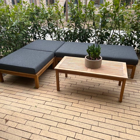 Estelle Havesæt loungesæt med sofa, to stole og rektangulært bord, fra Ilva. Stel i mørkt metal med armlæn og bordplade i trælameller. Hynder i mørkegrå tekstil på sofa og stole. Sættet er velegnet til terrasse eller altan som sidde- og afslapningsområde udendørs.