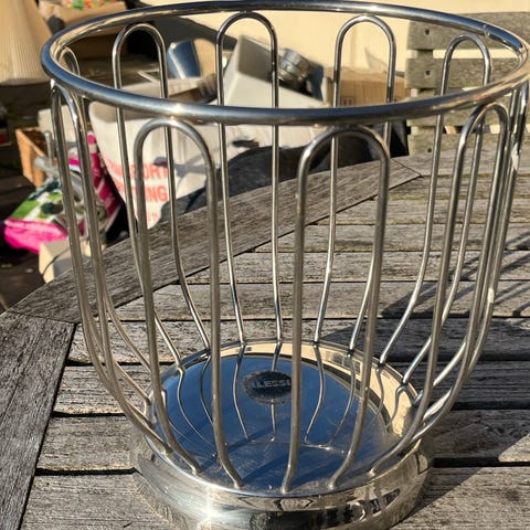 Rustfrit stål, frugtkurv/brødkurv fra Alessi ,blankpoleret. h. 13 cm. d. 23 cm., aldrig brugt.
