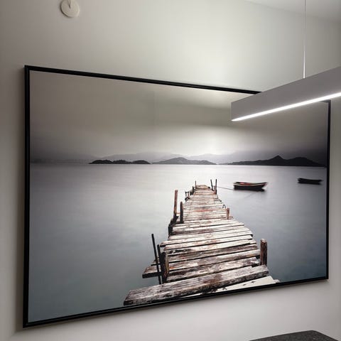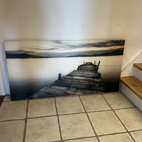Ilva billede med motiv af en lang træbro med rækværk på begge sider. Billedet er monteret i en sort, blank ramme. Velegnet som vægdekoration i stue, gang eller kontor. Kan hænges vandret på væg og giver et roligt, grafisk udtryk med perspektiv i motivet.