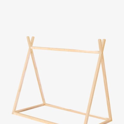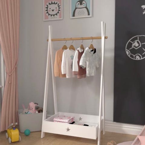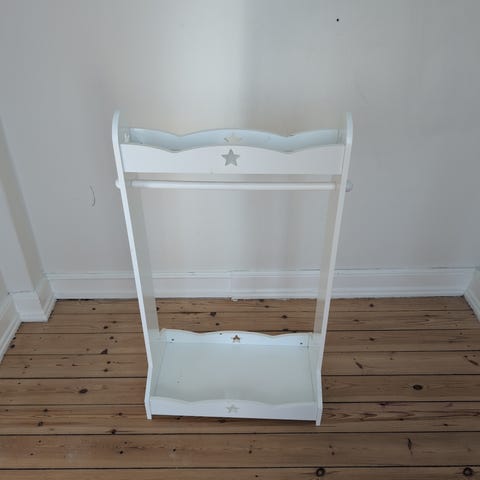 Meget sødt tøjstativ til børn i lyserødt træ. Stativet har en tværstang i lyst træ til ophæng af børnetøj, udklædning eller tilbehør. Nederst er der en åben bundhylde, som kan bruges til opbevaring af sko, kasser eller legetøj. Velegnet til børneværelse eller legehjørne, hvor barnet selv kan nå tøjet.