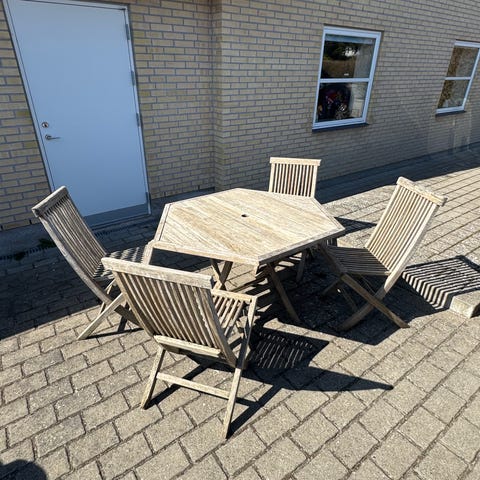 Havebord og havestole i træ. Sættet består af et rektangulært havebord med lameller samt hul til parasol og seks matchende havestole med armlæn. Bordet har klapper i enderne så det kan forlænges til ca dobbelt længde, så der kan være fire stole på hver side. Stolene har høj og justerbar ryg (seks stole). Der medfølger to store og fire små hynder (se billeder). Der medfølger desuden en mindre trækasse/bænk med lamellåg, som kan bruges til opbevaring eller som ekstra siddeplads.