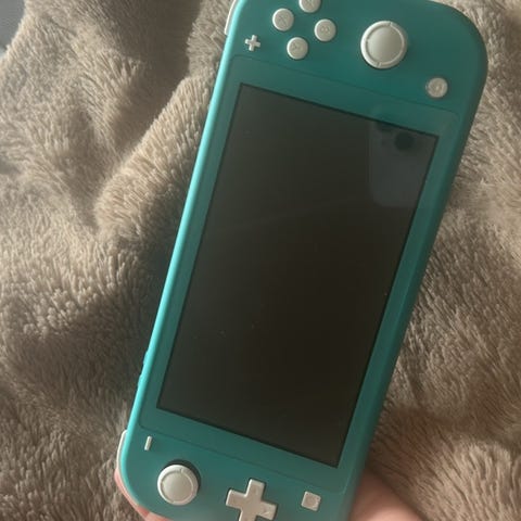 Nintendo Switch Lite konsol i turkis. Håndholdt model med indbygget skærm og faste knapper. Egnet til spil, der understøtter håndholdt tilstand på Nintendo Switch-platformen.