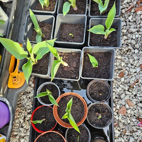 1 potte/20 kr. Flere små planter er sat i individuelle plastpotter med jord og står samlet i en bakke. Egnede til videre dyrkning indendørs eller udplantning, når de er vokset sig større. Velegnet til den, der ønsker at fortsætte pasning og omplantning efter behov.