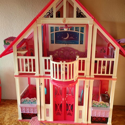 Barbie dukkehus i plast i pink og hvid. Huset har flere etager med åbne rum, og detaljerede tryk på væggene. Indvendigt ses blandt andet soveområde med seng, skrivebord og forskellige faste møbler og dekorationer. Egnet til leg med Barbie-dukker og lignende modedukker i tilsvarende størrelse.