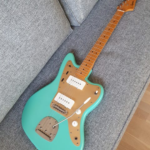 20 års Squier by Fender. Annervisary model, med det store hovede også, lyder virkelig fedt og er ny justeret virkelig fed at spille på, har nye strenge også. fantastisk guitar. fra 2002 , kan prøves inden køb og demonstres hvis det ønskes.