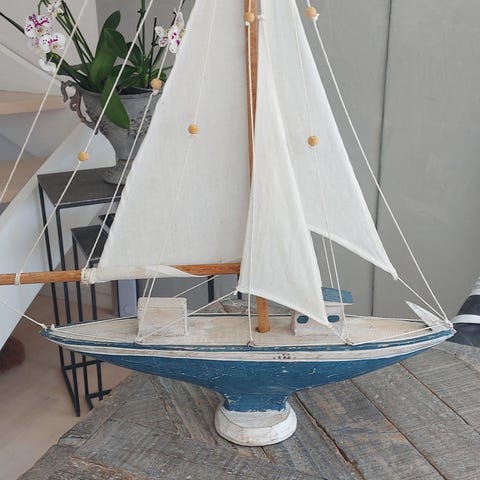 Modelsejlskib i træ med stofsejl. Skibet står på en fod/sokkel og har detaljeret dæk og rig. Egnet som dekoration i hjemmet eller på kontor, eller som samlerobjekt for modelskibe.