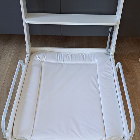 IKEA puslebord model Sniglar i lyst træ med en åben hylde under puslefladen - rigtig fin stand, ikke brugt ret meget. Der følger en løs puslepude med. God på steder med lidt plads, fylder ikke ret meget.