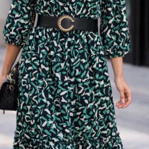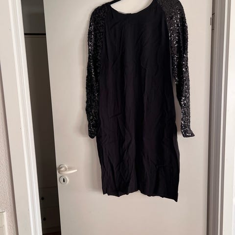 H&M kjole til dame i sort polyester, størrelse 44. Kjolen har lange ærmer med udskårne blomsterdetaljer og elastik ved ærmekanterne. Længden går omtrent til knæet afhængigt af højde. Let a-form og lynlås i nakken. Velegnet som hverdags- eller enkel festkjole. Måler 92 cm i længden og 55 cm fra ærmegab til ærmegab.