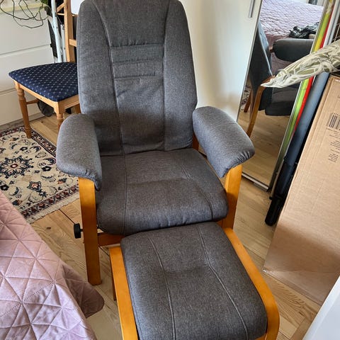 Lænestol med høj ryg og tilhørende skammel. Stolen har polstring i rødt stof og stel i lyst træ. Armlænene er i træ, og sædet har let formet og polstret siddeflade. Skamlen har samme røde stof og træben som stolen og er beregnet til at give støtte til benene. Velegnet som læse- eller hvileplads i stue eller opholdsrum. ! år gammel nypris 23.000 kvittering haves.