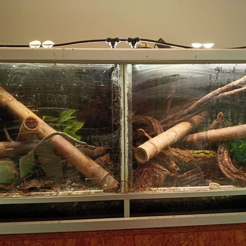 Leopard gekko + terrarie sælges. Gekkoen er 2 år og har aldrig fejlet noget. Terrariet, i glas, er med to huler, lys og varmelampe. Foder og vand skål medfølger + det sidste foder vi har.