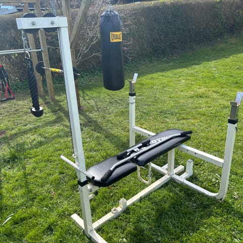 Træningssæt bestående af flad træningsbænk, fritstående vægtstativ og et sæt vægtskiver. Bænken har polstret liggeflade med sort overflade og rød kant samt metalben. Vægtstativet er fritstående i metal med plads til vægtstang. Medfølgende vægtskiver i forskellige vægtklasser, velegnet til styrketræning som bænkpres og andre øvelser i hjemmetræningsrum eller garage.