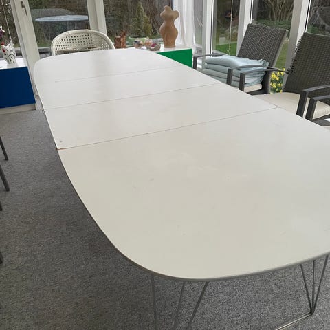 Bordet har brugsspor i form af pletter/misfarvning i overfladen. Vi har ikke selv forsøgt at fjerne dem, så det er muligt, at de kan forbedres med den rette behandling – men det kan vi ikke garantere.