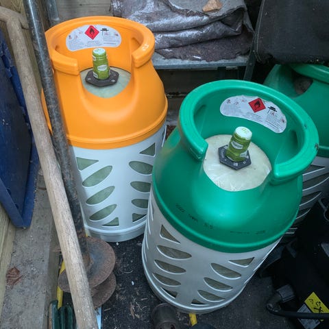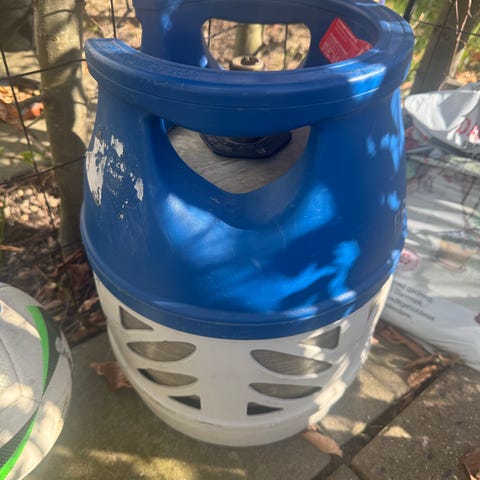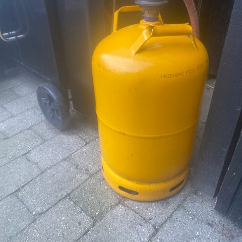 Gasflaske i kompositmateriale i orange og grå. Egnet til brug ved grill, campingvogn, terrassevarmer eller andre gasapparater, der passer til denne type kompositflaske. Kapacitet og tilslutning fremgår ikke af billedet og bør kontrolleres ved afhentning eller efter aftale med sælger.