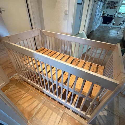 Ældre model tremmeseng incl. nyere madras, brugt men i god stand.