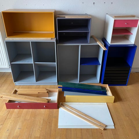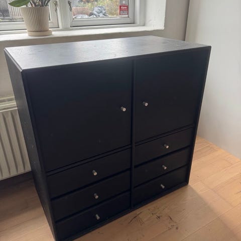 Tre sektioner Montana sorte grå to sektioner 70 × 70 × 38 og en 70 × 70 30 cm til kosten det er lidt ridser hist pister alleioner med ekstra hylder til 1200
