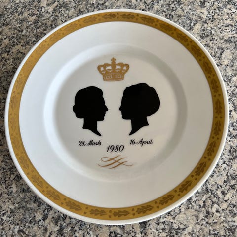 Royal Copenhagen mindeplatte fra 1980 med silhuetter af Dronning Ingrid og Dronning Margrethe II.