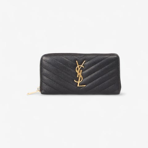 Elegant Saint Laurent pung i sort quiltet læder med det ikoniske YSL monogram i guldfarvet hardware. Den klassiske kuvertform og de fine chevron-syninger giver et eksklusivt, tidløst udtryk, som passer perfekt til både hverdag og aften. En stilren designerpung med et luksuriøst look – og et sikkert valg, hvis du elsker Saint Laurents minimalistiske æstetik.