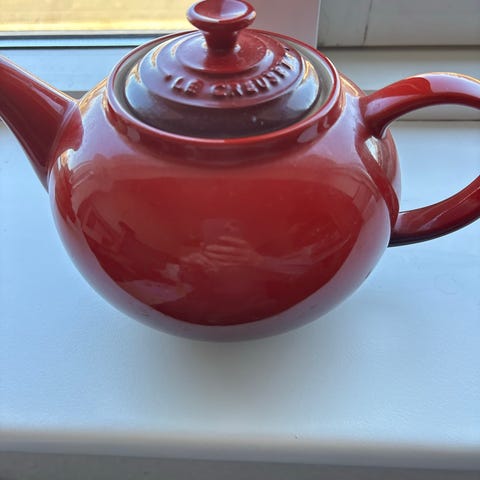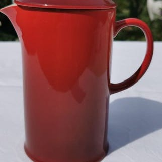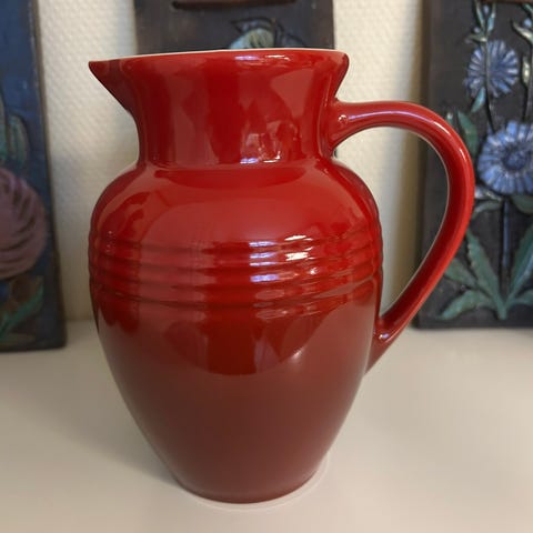 Le Creuset stempelkande i rød keramik.
