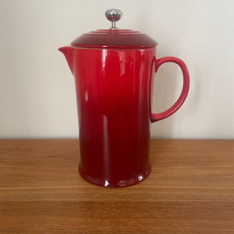 Kanden har låg med metalknop og integreret stempel i rustfrit stål med filter. Indersiden er glaseret i lys cremefarve, og bunden er præget med Le Creuset-logo. Velegnet til brygning af kaffe eller te med stempelmetode.