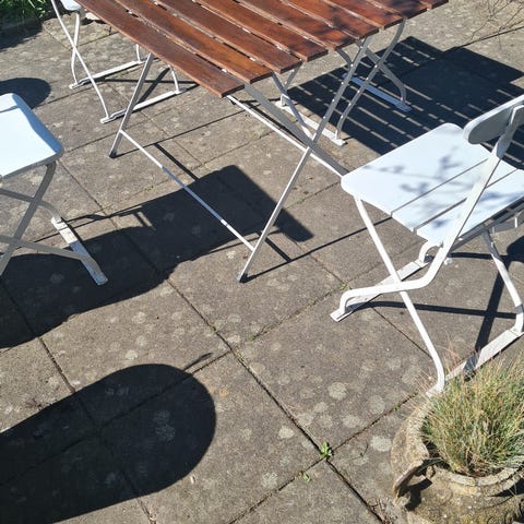 Havebordssæt bestående af et kvadratisk cafébord og to stole. Bordet har en metalfod med fire ben og bordplade i et mørkt materiale. Stolene har metalstel og sæde/ryg i mørke trælameller. Sættet er egnet til udendørs brug, f.eks. på terrasse, altan eller i haven som lille café- eller spiseplads. Stolene er design stole . Bordets mål er : højde 72 cm, længde 60 cm , bredde 60 cm. Samlet pris,