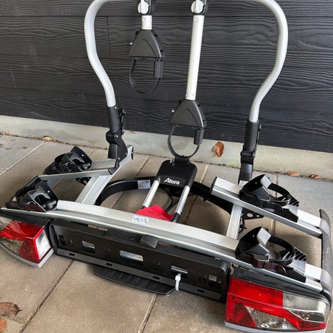 Thule cykelholder til anhængertræk. Der kan monteres to stk cykler på. Cykelholderen er beregnet til montering på bilens anhængertræk og har integreret lygtebom med baglygte og reflekser. Der er plads til ekstra nummerplade som er lovpligtigt Konstruktionen er i metal med plastdele, og holderen har skinner og holdere til fastgørelse af cyklernes hjul og stel. Egnede anvendelser er transport af cykler bag på bilen på længere ture eller til daglig kørsel.