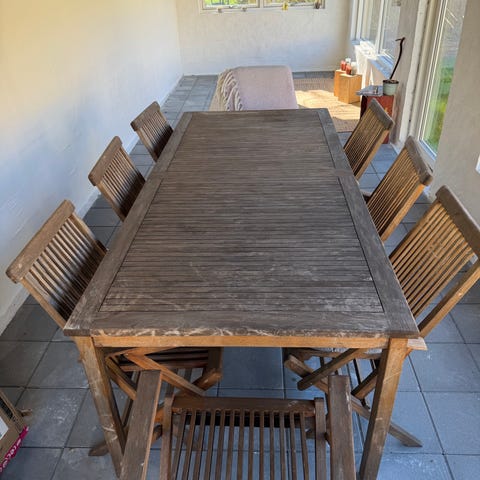 Havebordssæt bestående af et sekskantet bord i teaktræ og tilhørende klapstole i teak træ. Bordpladen er udført i lameller og har hul i midten, fx til parasol. Stolene er sammenklappelige med lamelryg og -sæde. Sættet er egnet til udendørs brug på terrasse, altan eller i have.