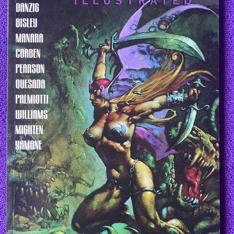 Richard Corben Den magiske øretegner tegneseriealbum. Forsiden viser farverig fantasy-illustration med figurer i kamp. Bagsiden har mindre illustration og forlagslogo. Albummet er i blødt omslag med synlig slitage på ryg og kanter, som ses på billederne. Egnet til samlere af fantasy- og tegneserielitteratur.
