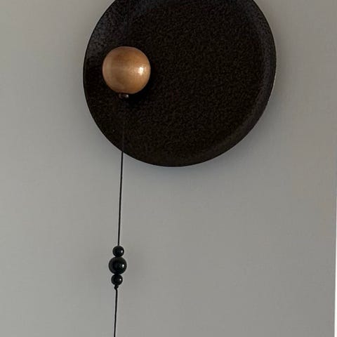 Vindspil i metal med sølvfarvede rør og mørkt træophæng. Består af flere hule metalrør ophængt i snore fra en træplade, med en træklokke i midten og en snor til at fange vinden. Velegnet til ophæng udendørs eller indendørs, f.eks. på altan, terrasse eller i vindue, hvor vinden kan få rørene til at klinge.
