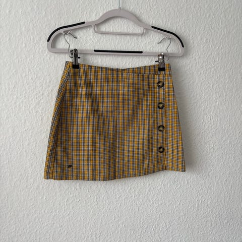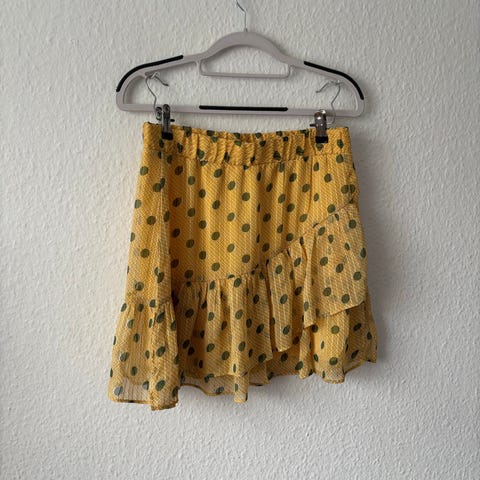 Neo Noir nederdel i størrelse XS. Nederdelen er gul og fremstillet i bomuld. Modellen har slå-om-look med flæsekant forneden og bindebånd i taljen. Passer til kvinder og kan bruges til både hverdag og mere afslappede anledninger.