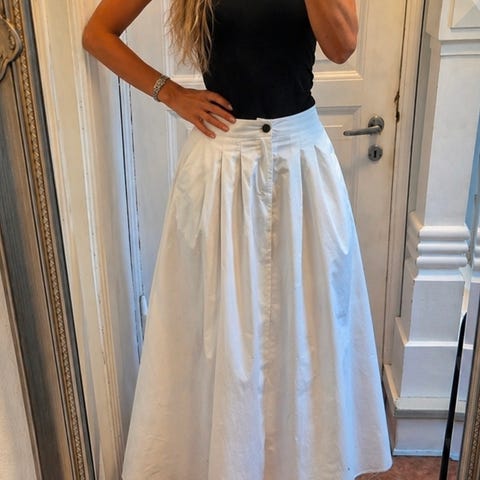 Mango denimnederdel i hvid til dame i størrelse S. Nederdelen er fremstillet i denim og har knaplukning ned langs fronten. Modellen har forlommer og bæltestropper i linningen. Velegnet som casual nederdel til hverdag eller fritid.