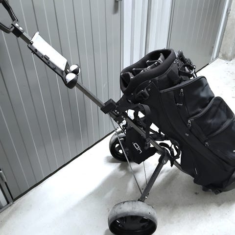 Golf trolley med to hjul. Trolleyen har sammenklappeligt stel og håndtag med rem til fastgørelse af golfbag. Udstyret med to solide hjul, der gør den egnet til transport af golfbag på golfbanen. Velegnet til manuel transport af golfudstyr.Den er meget let og god at rejse med,da hjul og bøjler er lige til at tage af.