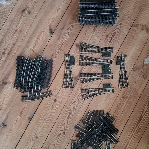Modeltog sæt med skinner, lokomotiver og vogne. Sættet omfatter 13 stk. lige og 24 stk buede skinner samt 4 stk sporskifter, 1 stk x spor, 1 stk bro , 4 stk diverse skinner, en ældre transformer/styreboks, Medfølger 2 stk. lokomotiver og forskellige togvogne. Tog og vogne skal repareres og evt benyttes som reservedele