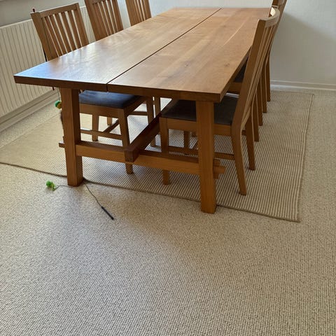 Egetræsbord med 8 stole og 2 tillægsplader sælges, billedet er med den ene tillægsplade i, bordet trænger til en slibning, bordet måler 2,5 meter med begge plader i.