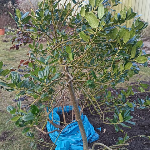 Fyrretræ i spand. Lige til at tage med, da det netop er taget op af jorden. Træet står i en sort plastspand, som kan bruges midlertidigt inden det plantes om i haven eller i en krukke.