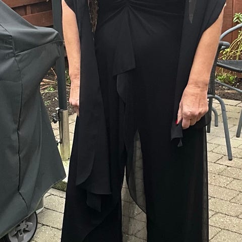 Fest/cocktailkjole til kvinder i sort polyester i størrelse L/XL. Kjolen har et langt snit og er velegnet til festlige lejligheder. Materialet er let skinnende, hvilket giver et diskret glitrende udtryk. Passer som klassisk festkjole til eksempelvis fester, middage eller andre formelle begivenheder.
