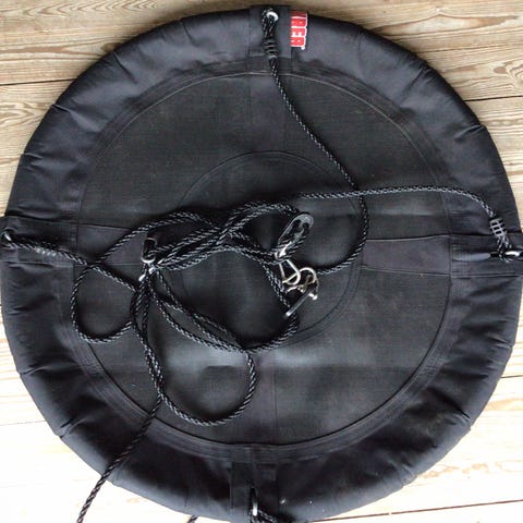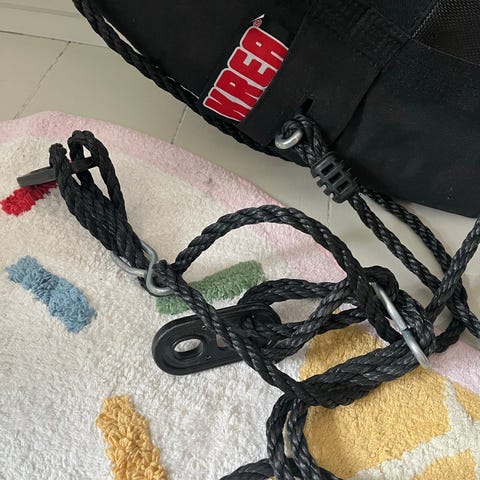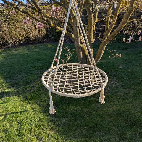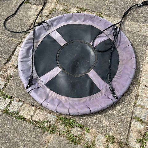 KREA sansegynge med kraftige reb og polstret kant. Egnet til ophæng i stativ eller træ i haven eller på legepladsen. Leveres med opbevaringspose som vist på billedet.
