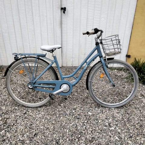 Alt virker som det skal. 3 gear med fodbremse. 26" hjul og 44 cm stel. Cyklen har fast lås og magnet lys på begge hjuler.