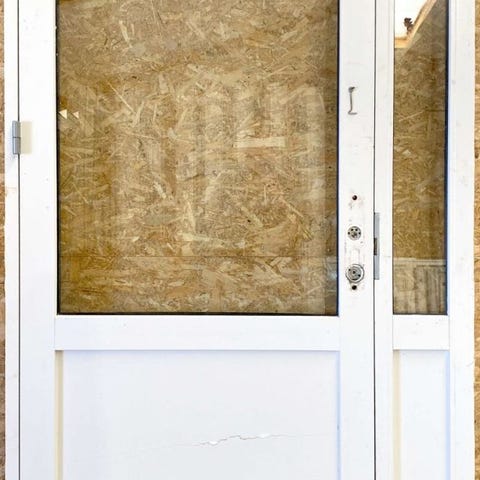 Rationel facadedør med sideparti med matteret glas, træ/alu. Hvid/hvid. Åbner indad. Mål: B117 x H213 x D12,5cm. Låsekasse er der sprunget en fjeder, så når håndtaget er trykker ned, så kommer den ikke op igen. Sælges uden cylinder og håndtag. Døren skal rengøres efter renoveringsprojekt. På billedet ses døren fra indvendig side.