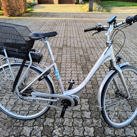 55 cm, 7 gear, støddæmper foran, 2 håndbremser, motor (Yahama) i kranken, justerbart styr, justierbar sæddel, stor batteri (100 km), punkteringsfrie dæk, 12 år, kørt næsten 10.000 km, (har altid stået indendørs), var hvert år til eftersyn og service