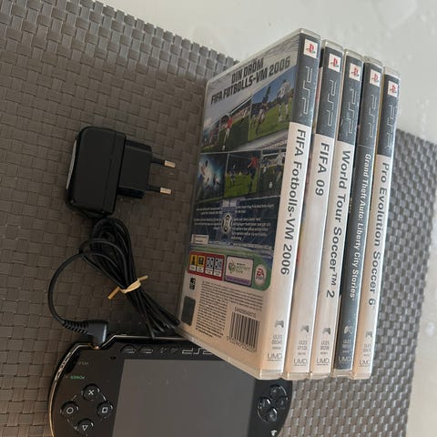 Sony PSP konsol med tilbehør. Sættet omfatter en bærbar PSP spillekonsol, strømforsyning/oplader, et beskyttende PSP-etui samt flere spil på UMD-diske, herunder blandt andet Assassin’s Creed Bloodlines, Tiger Woods PGA Tour 06 og andre racingspil. Konsollen er egnet til håndholdt gaming og afspilning af UMD-spil og multimedieindhold. Velegnet til brug derhjemme eller på farten med det medfølgende etui og oplader.