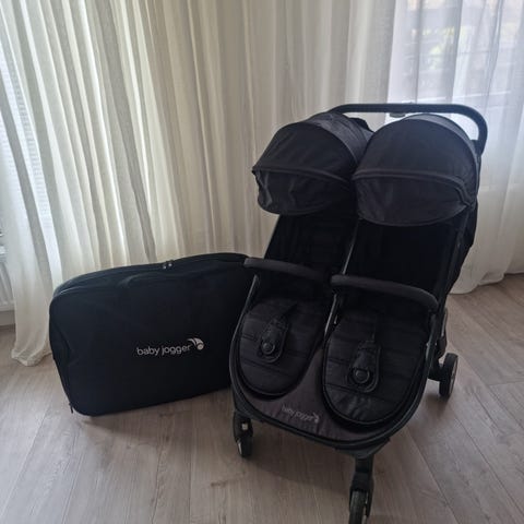 Klapvognen kan klappes sammen til kompakt størrelse og leveres med tilhørende transporttaske fra Baby Jogger, som ses på billederne.