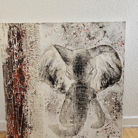 Maleri med elefantmotiv på lærred. Kvadratisk format på 100 x 100 cm, som vist på målebåndet på billederne. Maleriet er uden synlig ramme på billederne og fremstår som lærred spændt på blindramme.