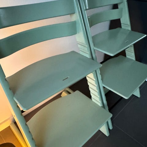 Stokke Tripp Trapp højstol i lyseblå. Klassisk træhøjstol med justerbar siddeplade og fodplade, der kan tilpasses barnets højde. Egnet til brug ved spisebord eller som siddeplads til børn. Overfladen viser brugsspor og afskalning af maling flere steder, som ses på billederne. Skal have et ny omgang maling for at stå skarpt. Strop medfølger ikke. Obs tror stolen er den gamle model.