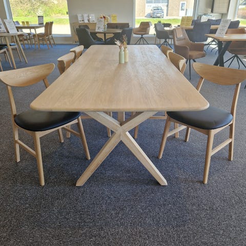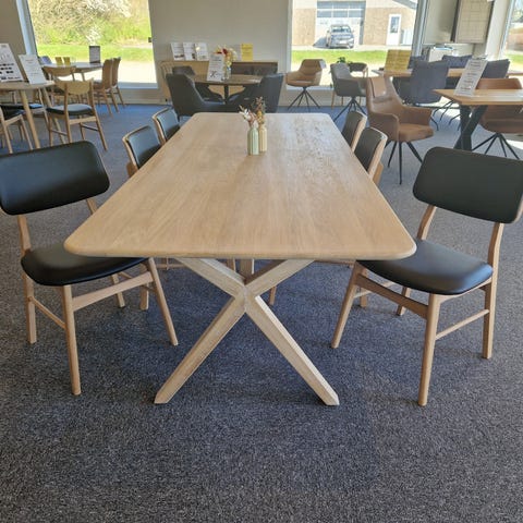 4 nye Mette stole vores mest sælgende stol. Vælg mellem hvidolieret eller naturolieret egetræ med ægte sort eller cognac læder på sæde & ryg.