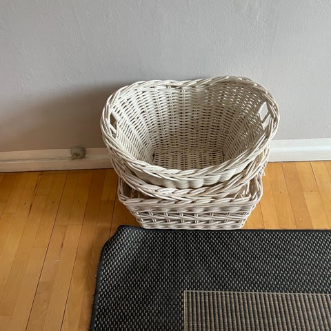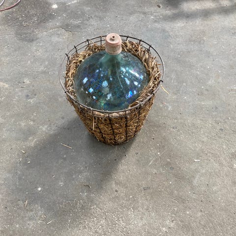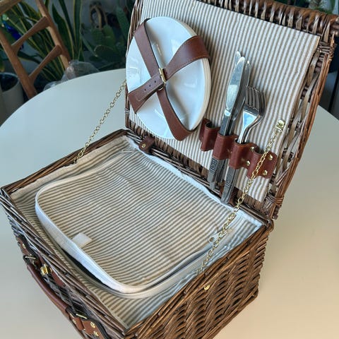 Den yndigste gamle kurv med blåternet foer og plads til 2 store flasker eller måske termokander.