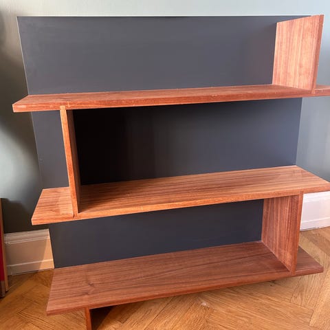 Rektangulær reol i træ med tre hylder, malet i en blød blå nuance, ideel til opbevaring og udstilling af bøger eller dekorationer.- Bemærk at mail, chat og beskeder ikke besvares, og varen skal købes på knappen "Gå til varen". Efter reservering af varen har du 10 dage til at afhente den i den butik, varen er på lager i.