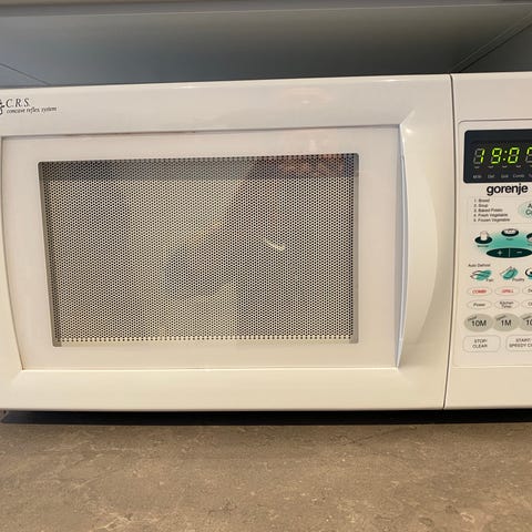 Gorenje mikrobølgeovn i hvid. Fritstående model med glasdrejetallerken og frontlåge med vindue. Betjeningspanel i siden med knapper og display. Velegnet til opvarmning og optøning af mad i køkkenet. Cm 47x31x30.